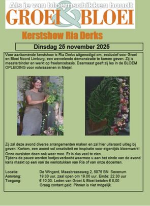| Op dinsdagavond 25 november houden we onze jaarlijkse kerstdemonstratie bloemschikken. Dit jaar wordt deze verzorgd door Ria Derks.Ria werkt al meer als 35 jaar in het bloemenvak en ze bloeit er nog helemaal van op. Ze noemt zichzelf dan ook een vak-idioot. In 1991 startte ze een bloemenwinkel Ardisia en in diezelfde periode werd ze ook gediplomeerd meesterbinder. Ria gaf ook bloemencursussen en workshops. Ze vond en vindt het nog steeds fantastisch om haar passie over te brengen op anderen.In 2005 gooide ze het roer om. Ze sloot haar fysieke winkel en ging door met bloemenopdrachten op bestelling en op afspraak. Sindsdien is ze op freelancebasis in te huren voor het restylen van een bloemenwinkel. Daarnaast helpt ze met regelmaat bloemisten die op vakantie gaan of een paar extra handjes nodig hebben. In 2018 leerde ze Moniek Koopmans kennen. Toen Moniek haar eerste dochter kreeg, nam Ria haar atelier waar. Toen Moniek de bloemenopleiding startte, was hun samenwerking definitief. Samen zijn ze een team, in de BLOEMOPLEIDING voor volwassenen, die ze geven in Meyel.Ria vindt het bloemenvak het mooiste vak dat er is. De kennis overdragen en delen is een cadeautje voor haar om te doen. Ook onze cursisten doen deze avond weer mee. Er is dus veel te zien deze avond.In de pauze worden lootjes verkocht. Zo maak je kans op een mooi bloemstuk van Ria of van onze docenten.Laat u inspireren hoe u uw huis voor de kerstdagen sfeervol kunt aankleden. U bent van harte welkom.Locatie: De Wingerd , Maasbreeseweg 2 SevenumAanvang: 19.30 uur, de zaal gaat om 19.00 uur open.Entree: Voor leden € 8,- niet leden €10,- svp betalen met gepast geld. Pinnen is niet mogelijk. | |